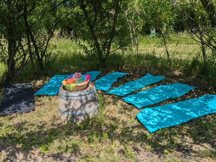 Meine Yogis im schönen Stadtmauergarten in Wachenheim, beim Sonnengruß